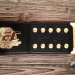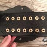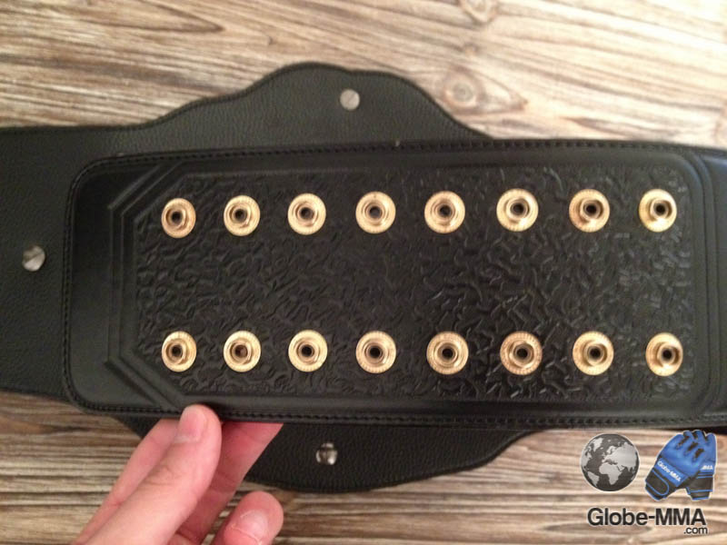 Les plaques sont coulées en alliage de zinc lourd, plaqué or 18 carats et argent, puis montés avec des clous et des vis sur la ceinture de cuir synthétique. La ceinture est équipée de 16 boutons-pression en laiton massif. Pas de soucis, vous pouvez l’attacher et la porter sur vous si vous n’avez rien à vous mettre en soirée !!