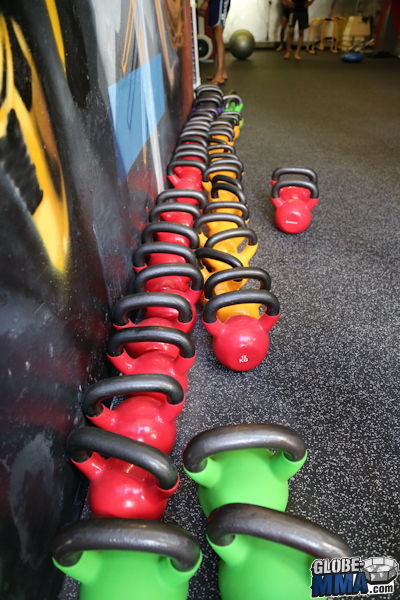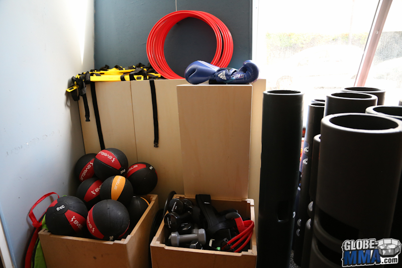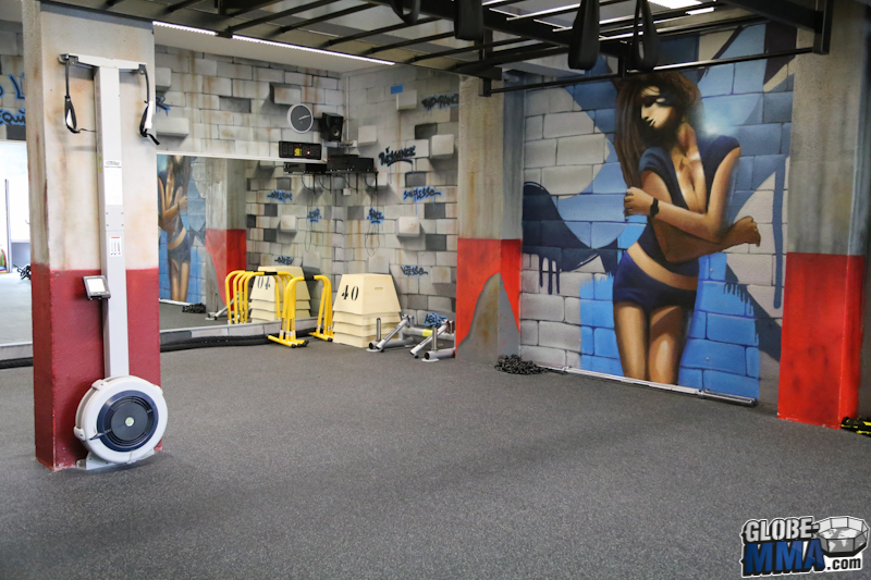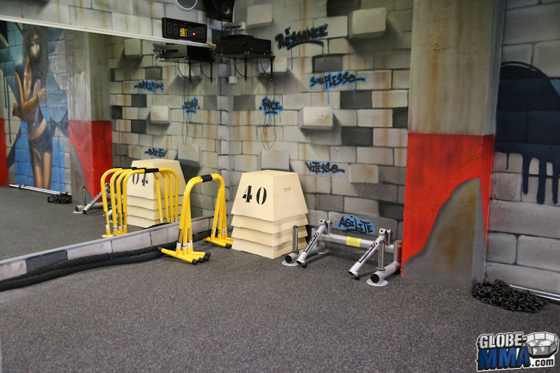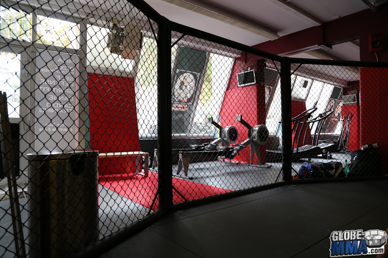 En entrant dans le training center, on trouve sur notre droite l’accueil et l’espace détente. Et à gauche la partie tatamis et crossfit. Comme vous pouvez le voir sur la photo, la partie tatamis comporte une partie grillagée de cage de MMA.