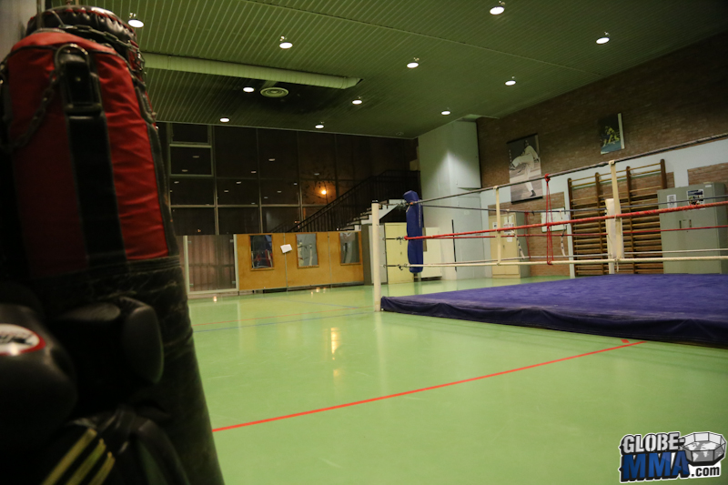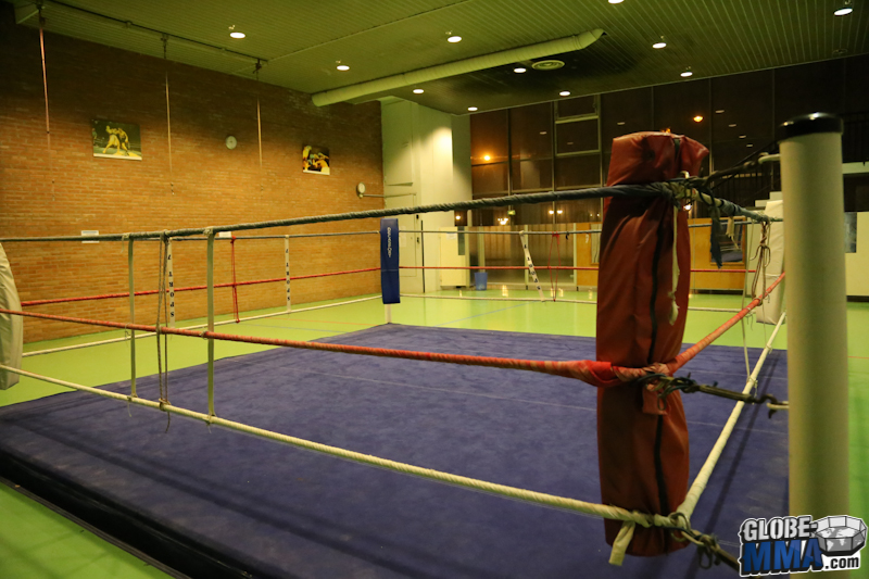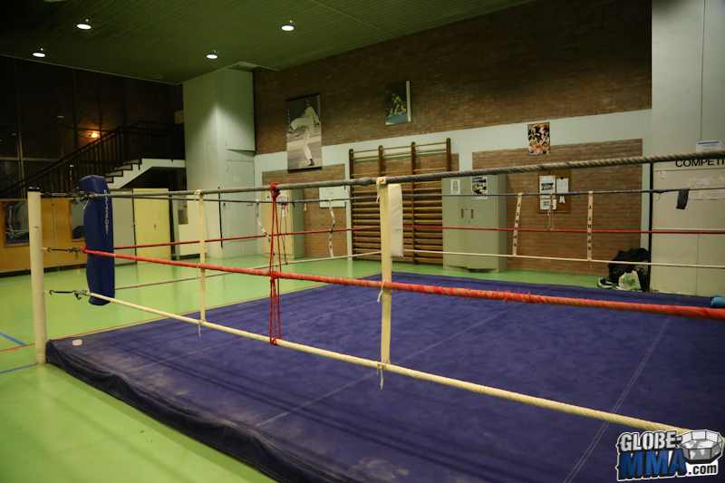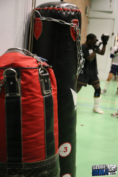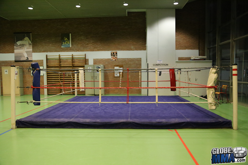 Akio Long, l’un des professeurs du club et ceinture noire de JJB de l’école Ricardo De la Riva, nous a ouvert les portes de son club. Dans le gymnase de l’université de Jussieu, deux salles sont mises à disposition pour les cours. Une salle pour le cours de pied-poing (photos ci-dessous) dans laquelle on retrouve un ring et des sacs de frappe.