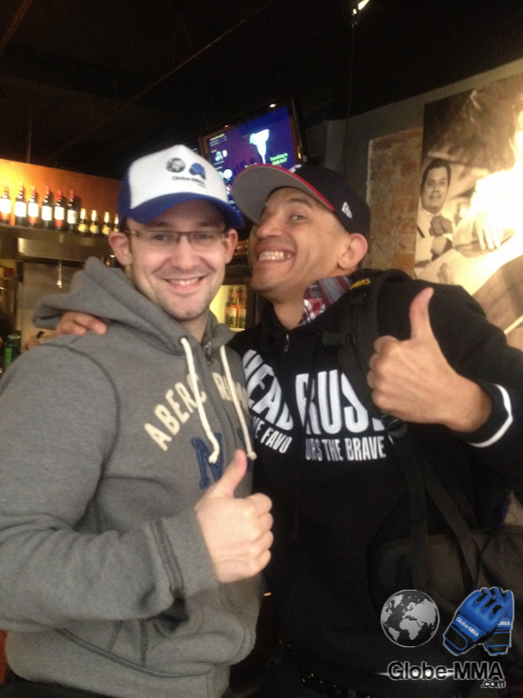 Je vais le saluer et discute avec lui de son combat de la veille. J’en profite aussi pour lui poser des questions sur ses origines. J’apprends qu’il est d’origine afro-américaine et indienne de la tribu des Iroquois. Cela attire mon attention, il m’explique que cette tribu vivait dans la région où se situe actuellement New-York. Cette région s’étendant même jusqu’au Québec. Dans notre conversation, il me dit qu’il s’entraîne dans l’Utah et qu’il va bientôt aller s’entraîner à Phoenix en Arizona avec Ben Henderson.