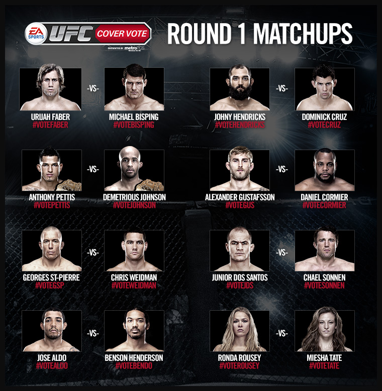 Les 16 combattants s’affronteront dans un tournoi à élimination divisé en 4 Rounds (voir ci-dessous). A chaque « affrontement » de votes, il ne restera qu’un combattant qui pourra peut-être, s’il est retenu jusqu’en finale, partager les honneurs de la couverture avec Jon Jones. Votez sur les confrontations ci-dessous et pour vous assurer que votre combattant préféré sera choisi pour la couverture du jeu EA SPORTS UFC !