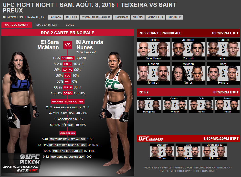 Quels sont vos pronostics pour ce combat ? Rendez-vous sur Kombat Sport pour la France (CanalSat canal 128 ou Numericable canal 160), RDS pour le Canada ou sur l’UFC TV en vous abonnant à l’UFC Fight Pass ! A bientôt sur Globe-MMA !