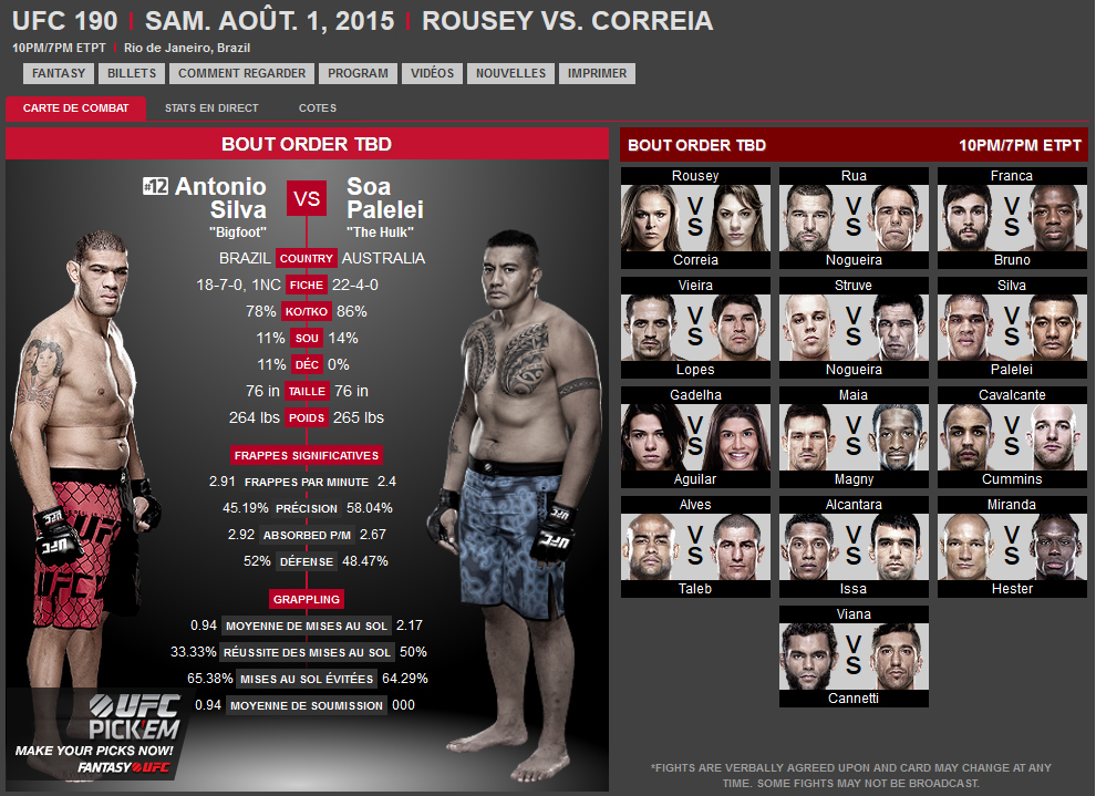 Antônio « Bigfoot » Silva n’a pas a gagné un combat depuis ces 4 dernières apparitions dans l’Octogone. Son prochain combat contre Soa Palelei samedi à l’UFC 190 à Rio est plus qu’important pour lui car il est sur la sellette… L’australien affiche un beau palmarès de de 22 victoires pour 4 défaites seulement avec pour son dernier combat une victoire par KO contre Walt Harris au 2ème round.