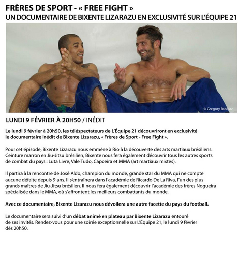 Ne manquez pas ce nouvel épisode de « Frères de Sport » consacré au MMA et au JJB qui sera diffusé le lundi 9 février à 20h50 sur l’Equipe 21. Le documentaire sera suivi d’un débat animé en plateau par Bixente Lizarazu entouré de ses invités. Rendez-vous pour cette soirée exceptionnelle sur l’Equipe 21 !