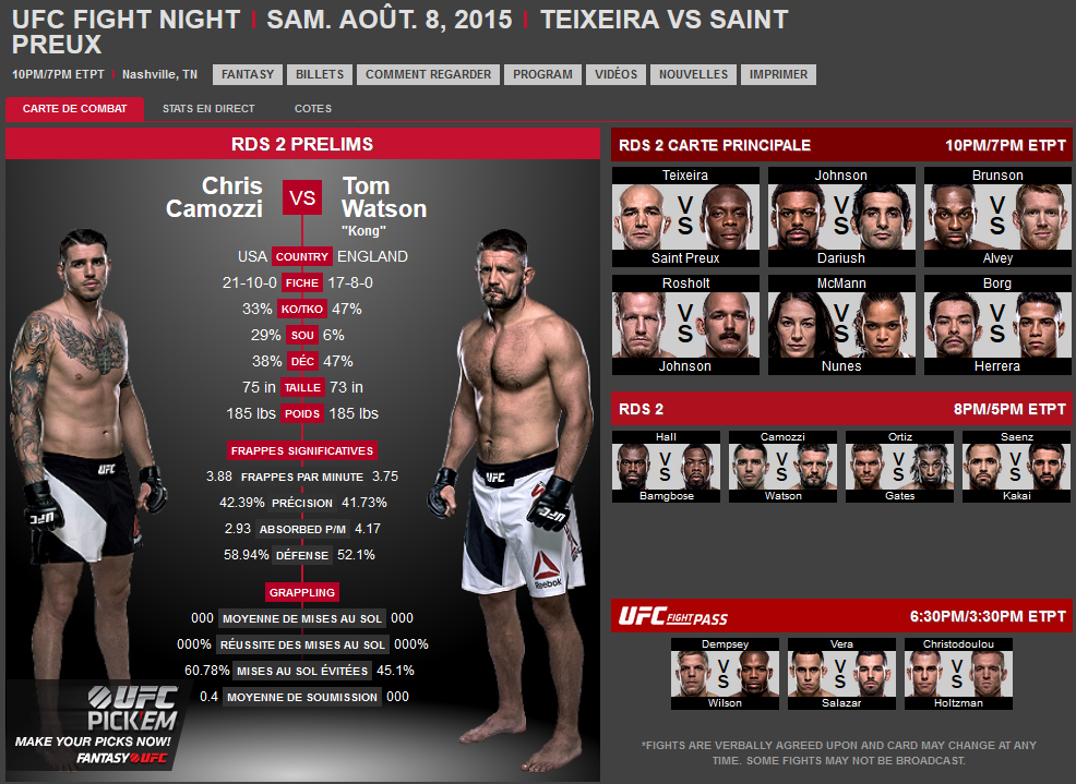Quels sont vos pronostics pour ce combat ? Rendez-vous sur Kombat Sport pour la France (CanalSat canal 128 ou Numericable canal 160), RDS pour le Canada ou sur l’UFC TV en vous abonnant à l’UFC Fight Pass ! A bientôt sur Globe-MMA !