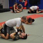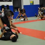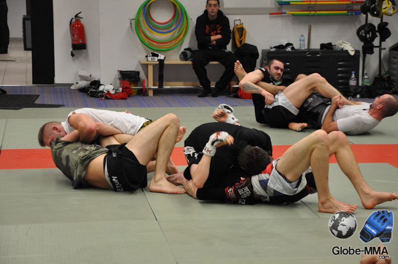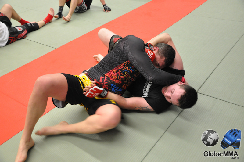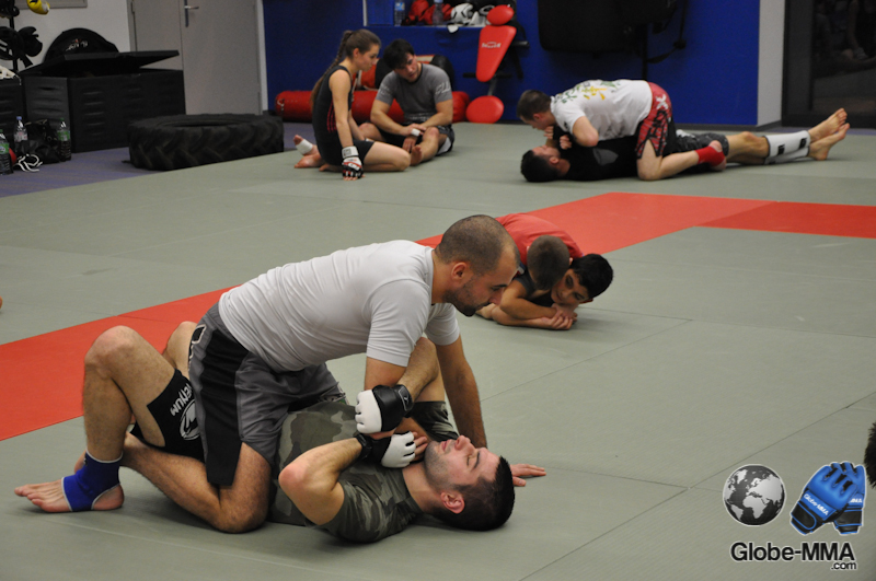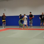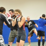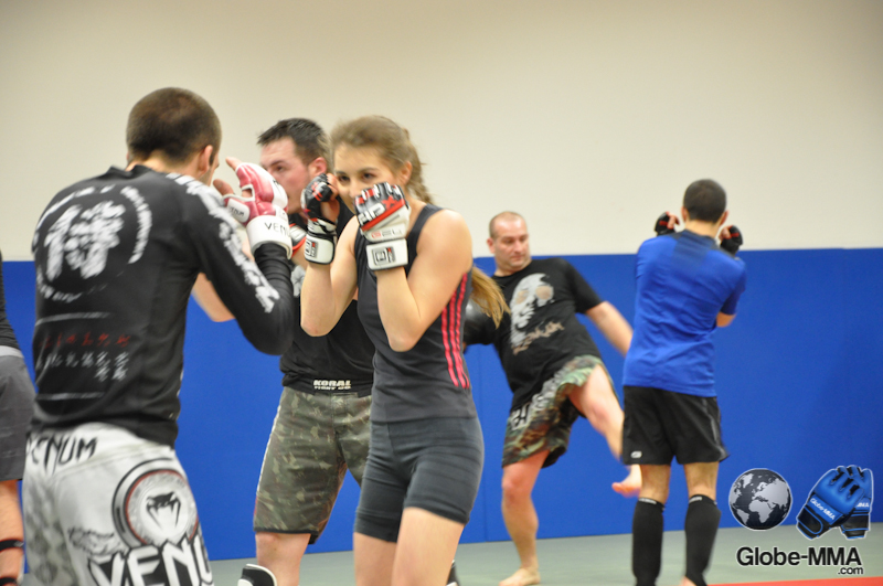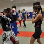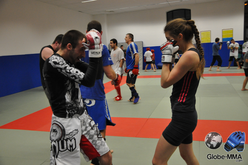 Il n’y a pas que des hommes qui pratiquent ici. Marianne, ceinture marron de Judo fait du MMA depuis quelques mois déjà et se débrouille plutôt bien !