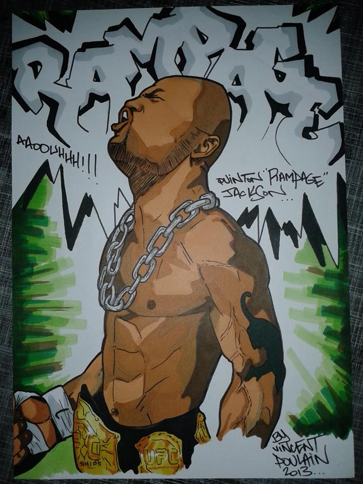 C’est difficile à dire. Je dirais que j’ai deux dessins favoris. Le dernier dessin que j’ai fait de Wanderlei Silva car il est mon combattant préféré !! Ensuite, je dirai le Rampage en mode Aaoooouuuuuh dans un style différent de ce que je fais d’ordinaire.