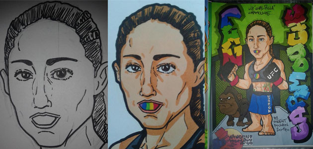 Je commence tout d’abord par choisir qui je vais dessiner. Si je n’ai pas d’idées précises, je regarde des magazines, sur le net. Puis, je me dis OK, je vais dessiner telle ou telle personne. Je commence toujours pas du crayon à papier puis dès que le croquis est fini, je commence en noir. Ensuite, je gomme mes traits et je commence avec mes couleurs aux marqueurs. Pour les idées, j’aime vraiment m’inspirer du combattant, chercher des détails de sa vie, ses passions, de son pays d’origine… Après, je laisse la magie s’opérer… ou pas 😉