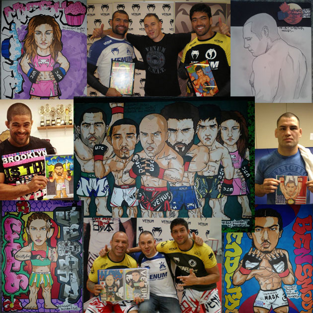 Je suis fan de MMA depuis 2001. J’étais néanmoins passionné des arts martiaux depuis plus longtemps. Tout a commencé avec les films de Bruce Lee, de Jean-Claude Van Damme et bien entendu Dragon Ball Z. J’ai ensuite découvert le MMA dans un fanzine Hip Hop (un seul numéro) avec Bertrand Amoussou. Je me souviens encore du titre de l’article : « Blood Sport ». Sur l’article, il y’a avait des photos de l’UFC avec Don Frye, les frères Gracie… Au départ et pendant des années, je dessinais beaucoup de mangas. Ensuite, en 2005, après le GP du Pride, j’ai fait un premier dessin de Shogun et Rampage. Puis, plus rien… Jusqu’en 2012, lors de ma rencontre avec Wanderlei Silva pendant le stage organisé par Dragon Bleu. Ce fut un gros choc émotionnel pour moi. C’est également à ce moment là que je fais la rencontre de JB. On discute de tout et surtout de notre passion commune : le MMA. C’est à partir de ce moment là que j’ai commencé à dessiner des personnes issues du MMA.