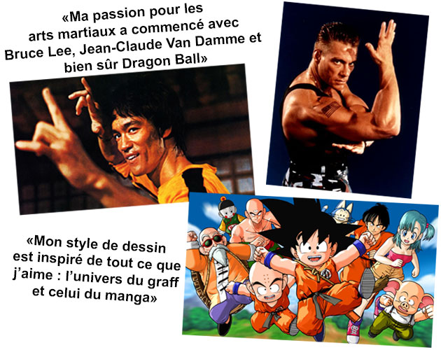 Mon style est propre à moi. Je dirais que c’est un mélange de tout ce que j’aime et de tout ce qui m’a influencé. Tout d’abord, le graffiti, avec un Monsieur qui s’appelle Mode 2 et qui, selon moi, faisait parti des meilleurs B Boys dans tous les graffitis du monde. Ensuite, le mangaka Akira Toriyama Sensei m’a influencé de 1992 jusqu’à aujourd’hui encore. J’aime tout son univers et si un jour il vient en France, je te jure que je serai comme un gosse 😉 Je n’ai jamais pris de cours de dessins, je fais ça depuis toujours. Je ne fais pas que de la caricature ou du portrait, du manga ou encore du graffiti, je fais tout cela à la fois. C’est ça mon style !