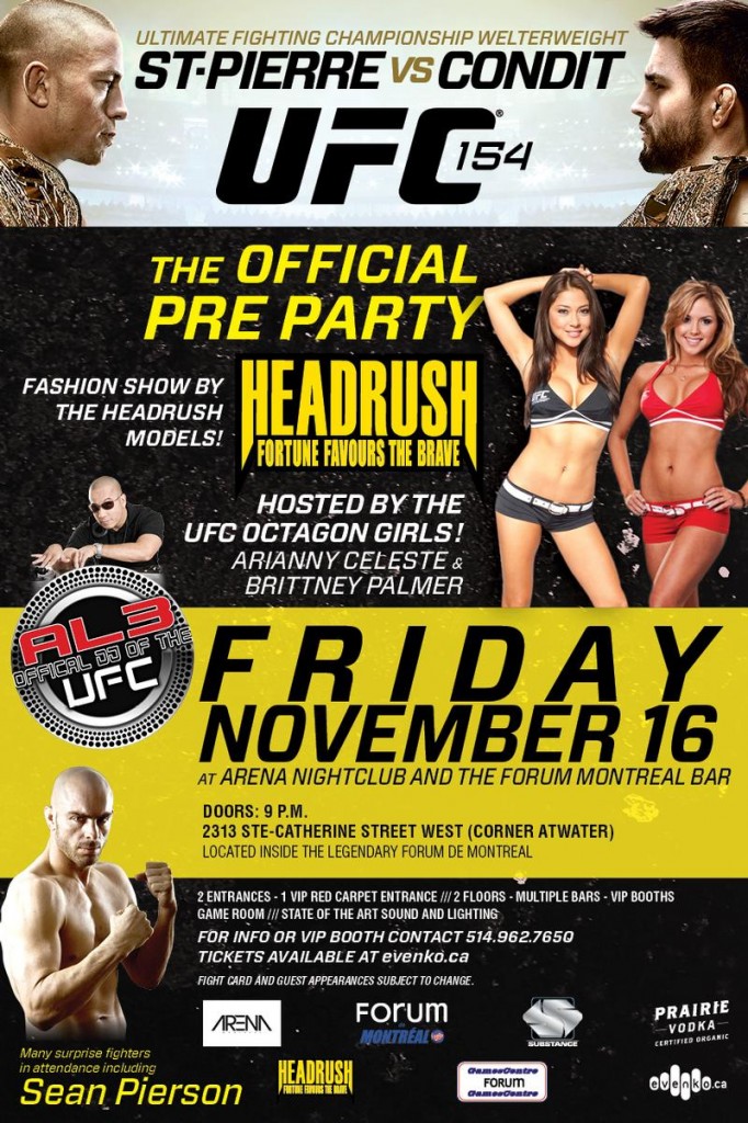 Vivez avec moi ce nouveau reportage exceptionnel pour l’UFC GSP vs Condit à Montréal au Québec. Pour cette première partie, je vous propose de faire un petit tour avec moi au centre de Montréal, de participer à la pesée, de passer une super soirée, celle organisée par Headrush : la pre-party de l’UFC 154, de faire quelques rencontres et plein d’autres choses encore…