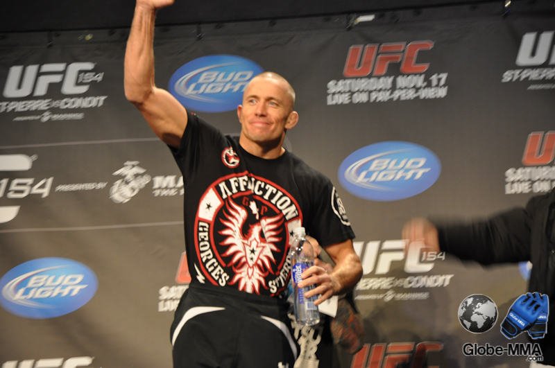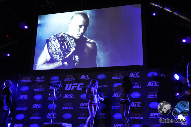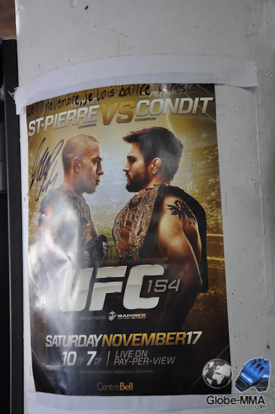 Juste pour l’anecdote, une affiche de l’UFC 154 est accrochée sur l’un des poteaux de la salle. Dessus est écrit : « Le 17 novembre, je vais battre Carlos Condit », signé GSP. Le message est clair !!