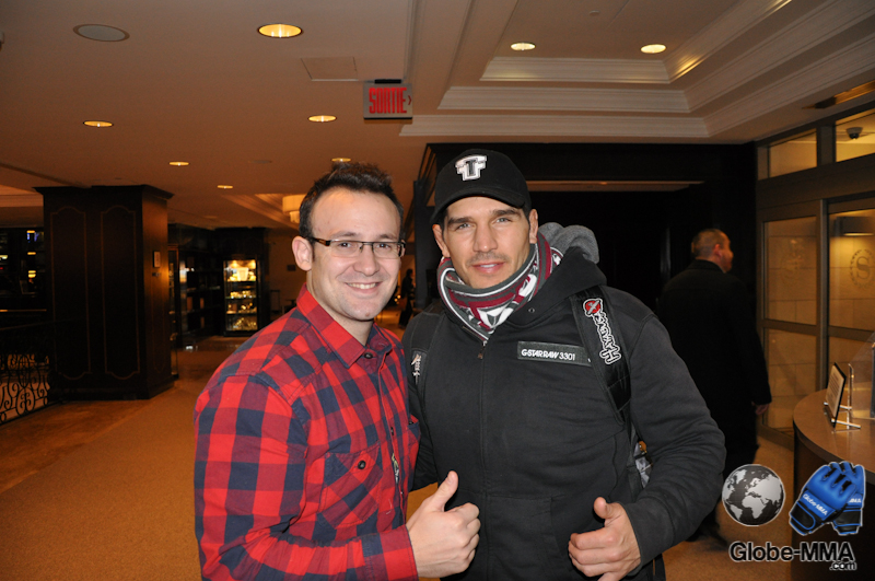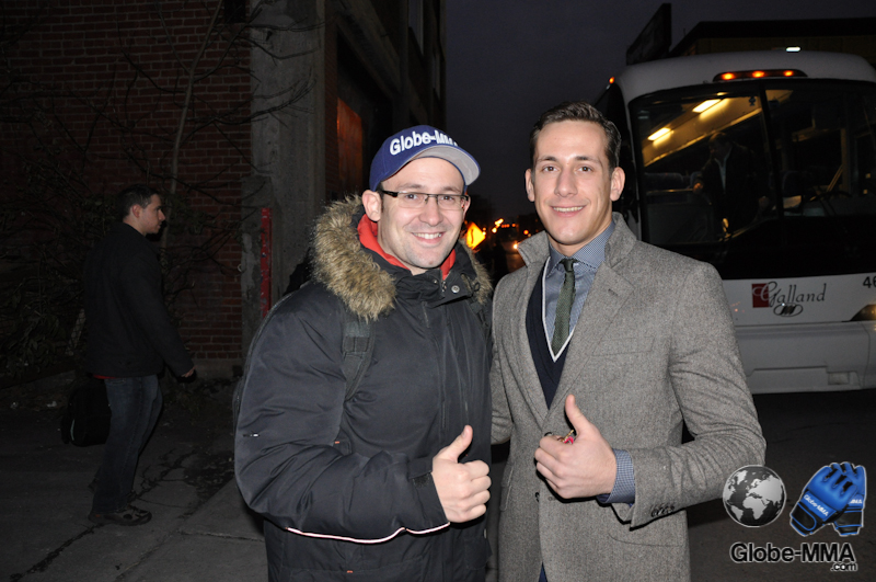17H : C’est la fin de la pesée. Je sors de la salle et croise un combattant que je suis chaque semaine au TUF Carwin vs Nelson, il s’agit de l’un des coéquipiers de GSP et très bon ami de Rory MacDonald : Mike Ricci, dont on ne sait toujours pas s’il sera en finale du TUF (ou pas ;).