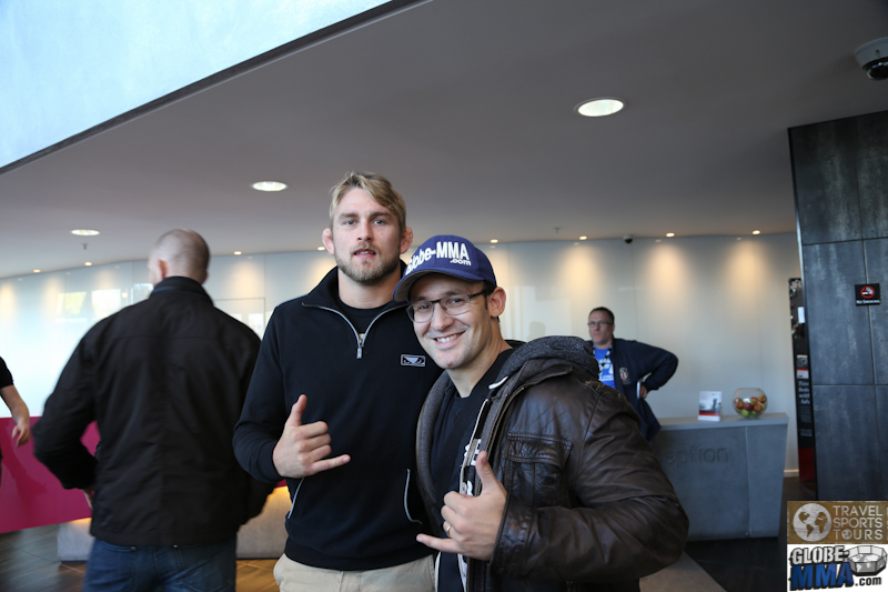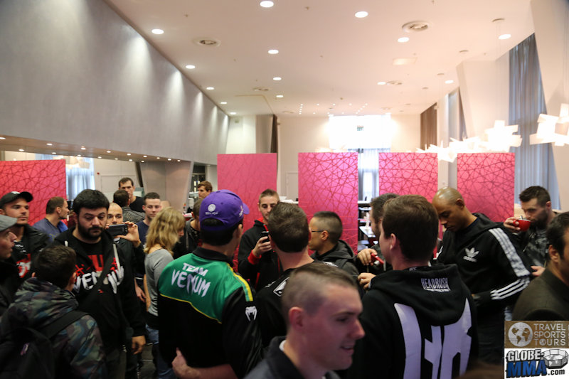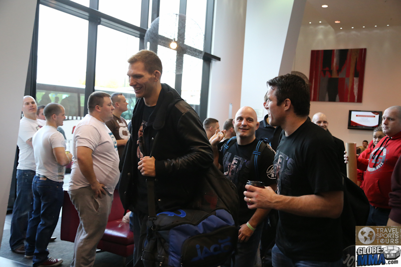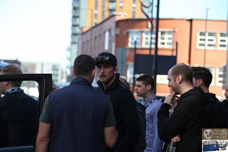 En sortant de l’hôtel, on croise de nouveau Michael Bisping en train de discuter avec Alexander Gustafsson, sur le point de partir à la séance de dédicaces organisée avant la pesée.