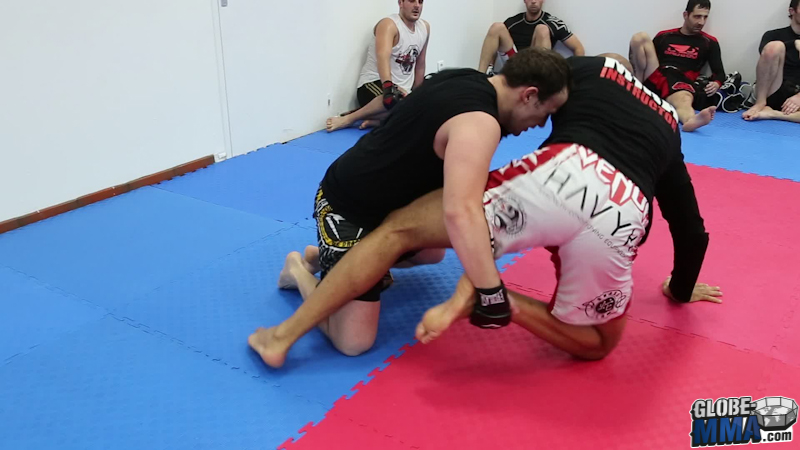 Et ça reprend de plus belle avec une technique d’amené au sol à partir du single leg, une forme de « Te-Guruma » en Judo.