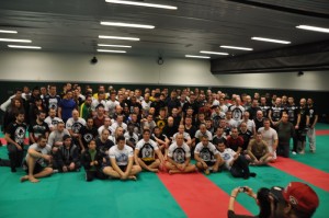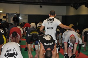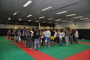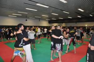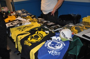 Un stand Venum était installé à l’entrée du dojo où l’on pouvait se procurer les derniers produits avec des promos « stage » : fightshort, casquettes, t-shirts, gants.. Dragon Bleu vendait en avant-première le t-shirt du TUF Brazil de Wanderlei, dispo en jaune et bleu: