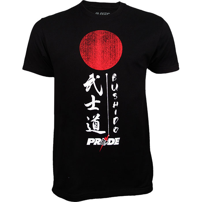 Le t-shirt est tout noir avec le soleil levant rouge, l’inscription « Bushido », des caractères kanji et le logo du Pride sur le torse. Cependant, il n’y a rien au dos…