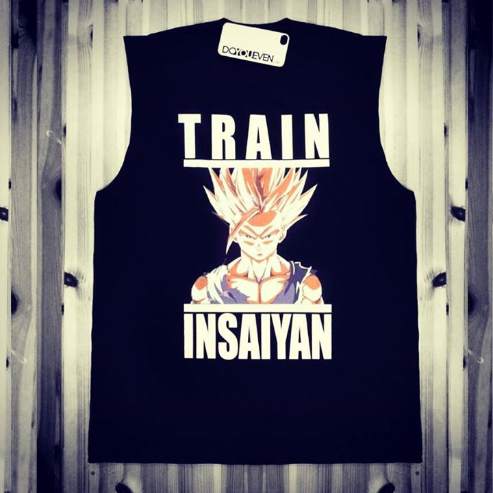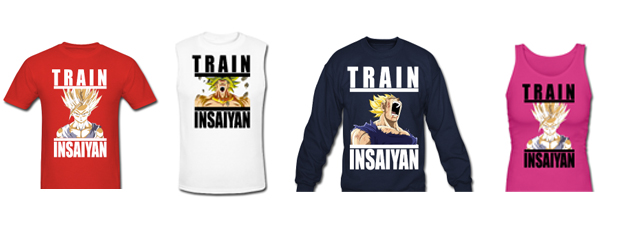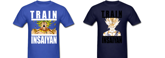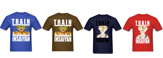 Le t-shirt représente différents personnages dont Sangohan, Vegeta et Broly en mode Super Saiyan. L’inscription sur le t-shirt « Train In Saiyan » peut se comprendre de deux façons : « S »entraîner comme un Saiyan » ou bien « S’entrainer dur » (jeu de mot en anglais « Train Insane »).