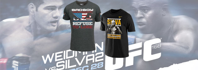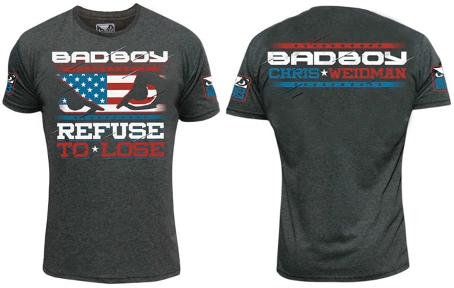 Pour cet UFC 168, Weidman portera son t-shirt Badboy Refuse to Lose. De couleur grise, on retrouve à l’avant du t-shirt la marque ainsi que son logo dans lequel est incrusté le drapeau américain. Sous le logo, est inscrit « Refuse to lose ». Le message est lancé ! Chris Weidman veut conserver sa ceinture de champion Middleweight !