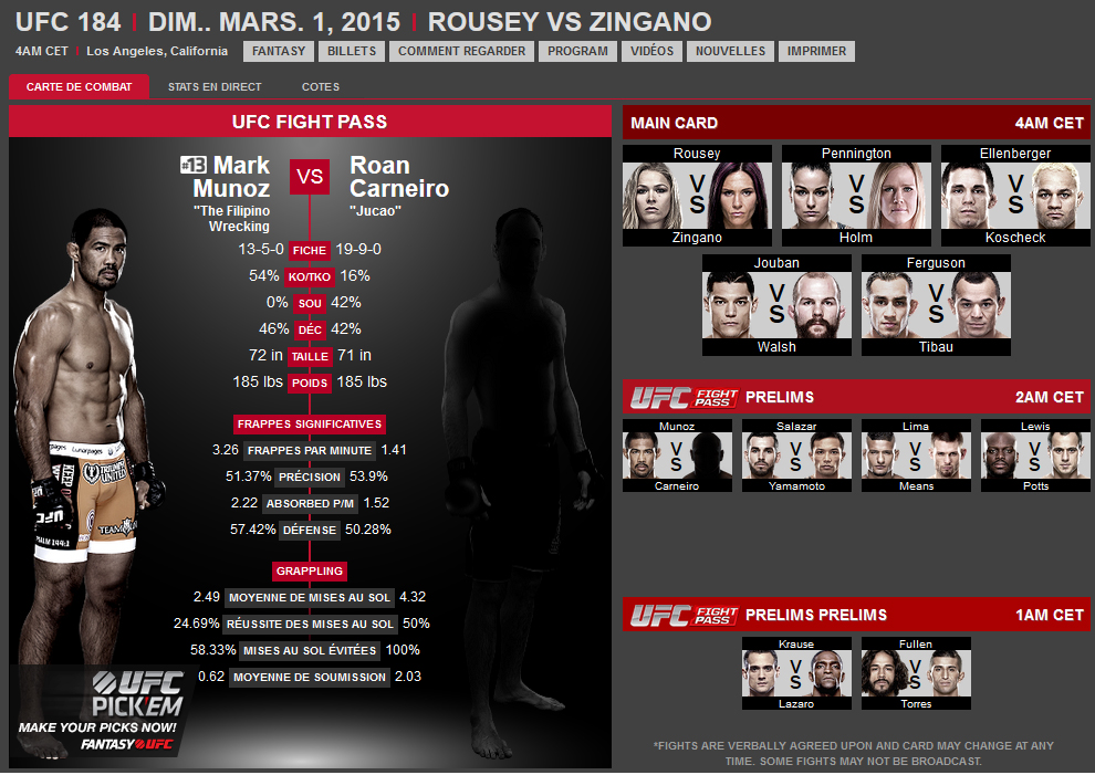 9 ans après son dernier combat à l’UFC, Roan « Jucao » Carneiro (19-9) est de retour dans l’organisation pour affronter l’américain Mark Muñoz (13-5) lors de l’UFC 184 de Los Angeles le week-end prochain. « Jucao » est sur une série de 5 victoires en MMA dont 3 victoires dans une même soirée en octobre dernier, lors du Battlegrounds MMA, un tournoi auquel ont participé 8 combattants et qu’il a remporté ! Mark est quant à lui sur une défaite contre Gegard Mousasi à l’UFC de Berlin l’année dernière. Sa 3ème défaite sur ses 4 derniers combats.