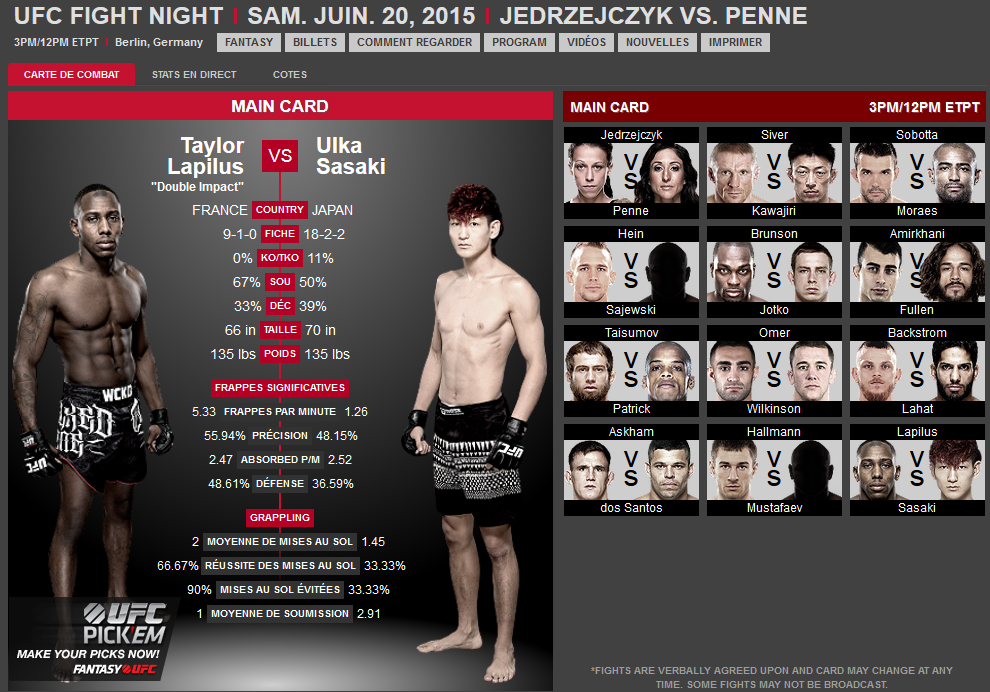 Quels sont vos pronostics pour ce combat ? Rendez-vous sur Kombat Sport pour la France (CanalSat canal 128 ou Numericable canal 160), RDS pour le Canada ou sur l’UFC TV en vous abonnant à l’UFC Fight Pass ! A bientôt sur Globe-MMA !
