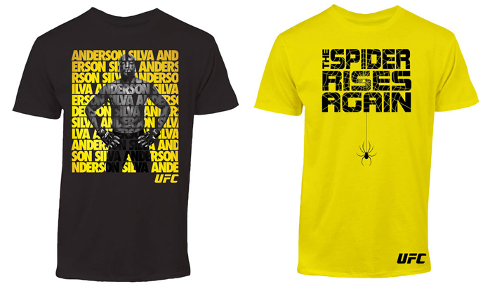Deux autres modèles sont également proposés (ci-dessous). Sur le modèle « Repeat » noir, on y voit Anderson Silva écrit en jaune en mode repeat, et en filigrane du nom la photo de Silva debout les mains sur les hanches. L’autre modèle est de couleur jaune. Sur l’avant est inscrit « The Spider Rises Again » en noir avec fond de toile et une araignée suspendue à son fil .