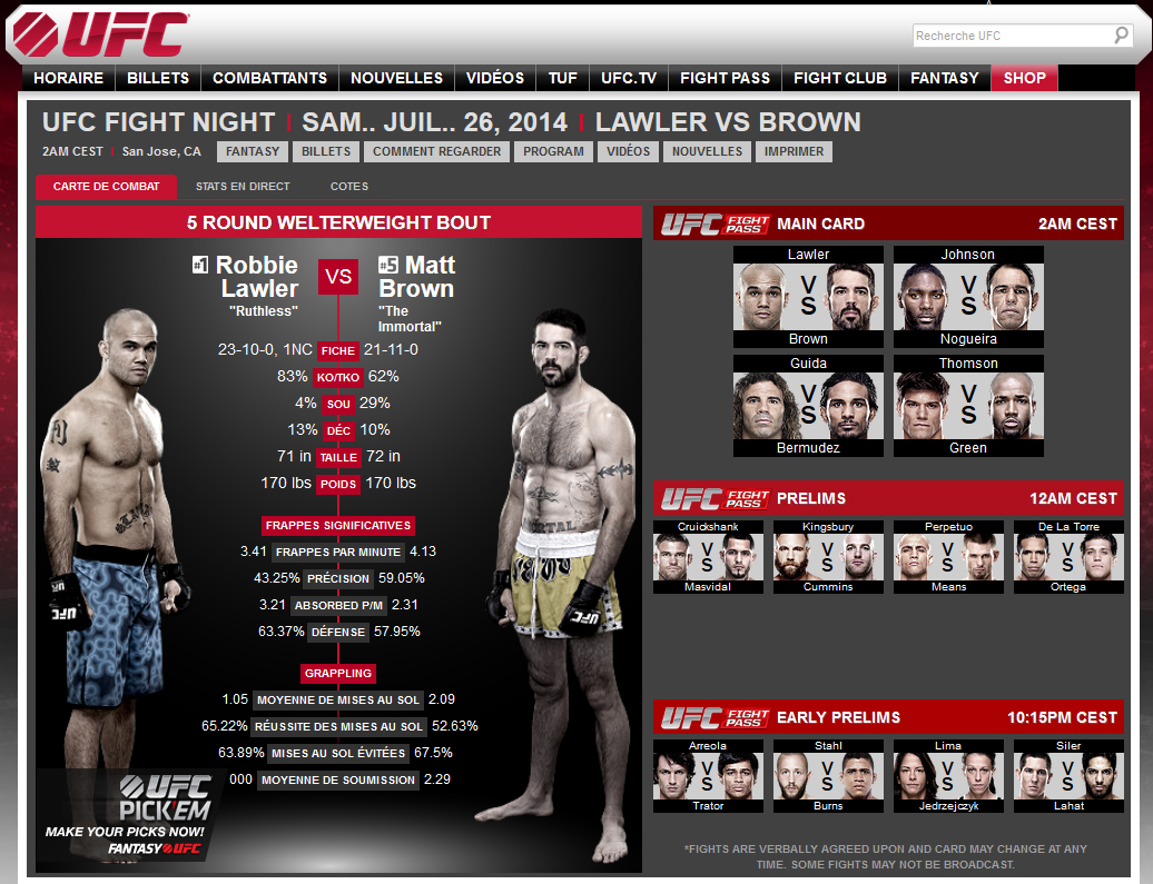 Le retour du challenger numéro 1 des poids welters Robbie Lawler se fera dans la ville de San José face au très dangereux Matt Brown pour un UFC Fight Night sous le signe de la puissance ! Lawler est un athlète hors du commun doté d’un punch surhumain pour un homme de son poids et a prouvé encore dernièrement face à Ellenberger qu’il fallait avoir une énorme résistance pour l’affronter… Pour relever le défi, Matt « The Immortal » Brown et sa capacité à absorber les coups est le client parfait pour causer quelques soucis à la machine Lawler et livrer un vrai combat épique !