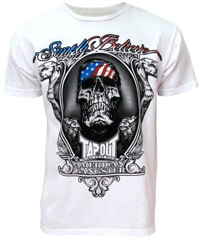 « Bien que ma chair peut mourir et pourrir, mes couleurs resteront à jamais! » L’American Gangster porte fièrement son bandana drapeau américain sous le slogan TapouT « Simply Believe » sur le devant de ce t-shirt.